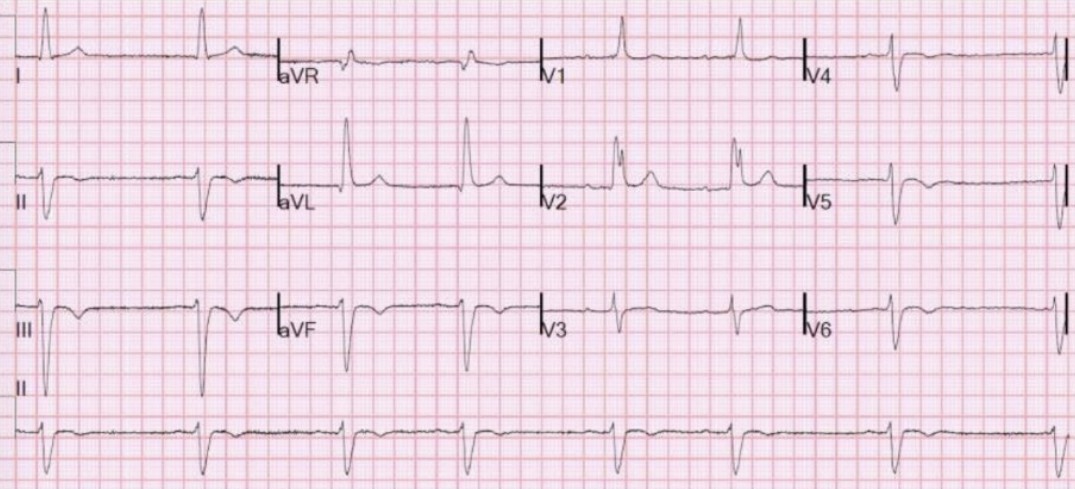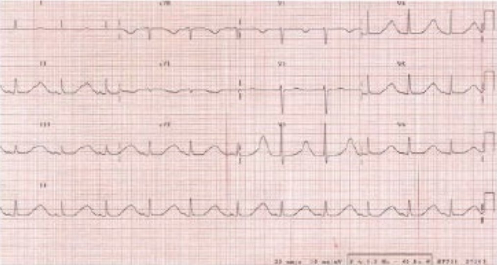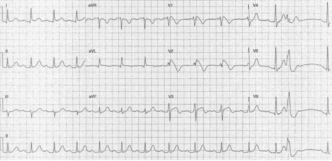 A 35-year-old woman presents to the ED with central chest pain and two syncopal episodes.